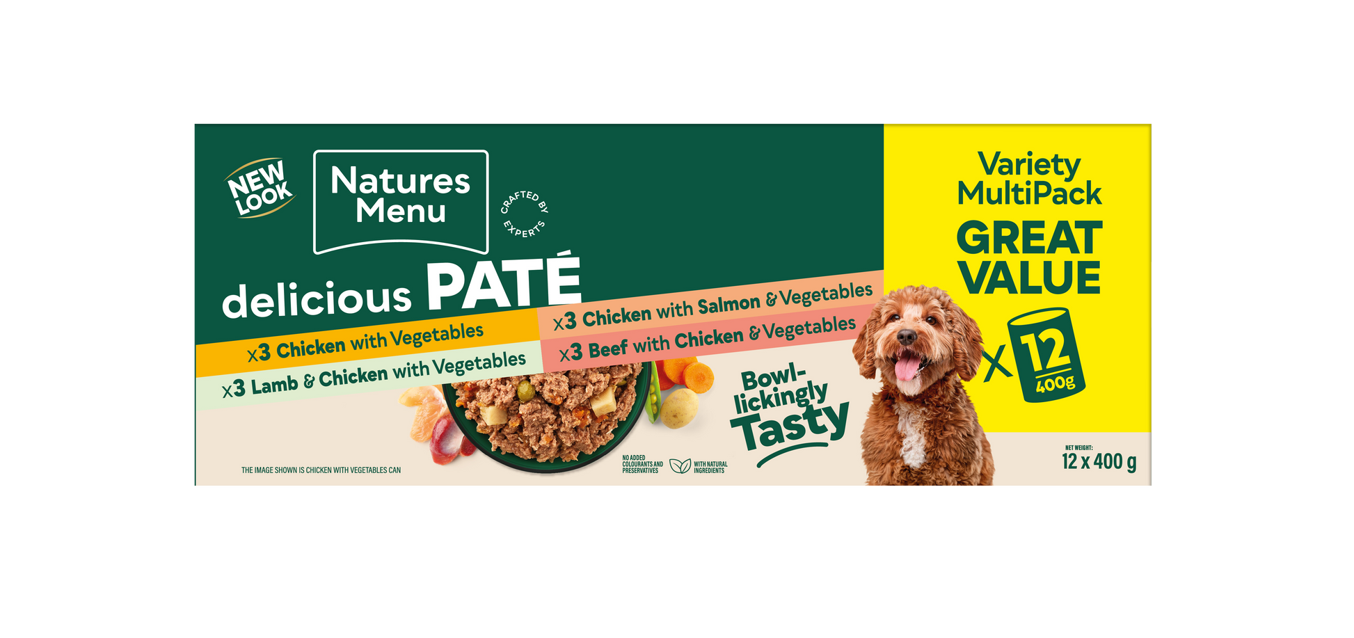 Available in a Multipack, all four delicious adult flavours in one outer case.Made with a high content of real meat with no meat derivatives or meat meals. This makes for a top quality more nutritious and digestible meal for your pet. All cans are filled with top quality raw ingredients and then steam cooked once to ensure the nutrients stay within the product.Steam cooked to retain nutrients55% min actual Meat, No meat derivativesComplete and BalancedFree from artificial colours, flavours and preservativesPack size 12 x 400g