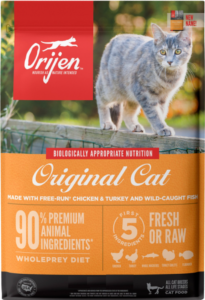 All cats and kittens are evolved as carnivores, designed by nature to thrive on whole prey such as fowl or fish, and possessing a biological need for a diet rich and varied in fresh whole meats with smaller amounts of fruits, vegetables and grasses. that�s why orijen cat & kitten features unmatched inclusions of cage-free chicken and turkey, wild-caught fish and nest-laid eggs � all farmed or fished within our region and delivered to our kitchens fresh each day, so they�re brimming with goodness to nourish your cat or kitten completely. INGREDIENTS Fresh boneless chicken (20%), dehydrated chicken (15%), fresh chicken liver (4%), fresh whole herring (4%), fresh boneless turkey (4%), dehydrated turkey (4%), fresh turkey liver (3%), fresh whole eggs (3%), fresh walleye (3%), fresh whole salmon (3%), fresh chicken heart (3%), chicken cartilage (3%), dehydrated herring (3%), dehydrated salmon (3%), chicken liver oil (3%), chicken fat (2%), red lentils, green peas, green lentils, sun-cured alfalfa, dried kelp, pumpkin, butternut squash, spinach greens, carrots, apples, pears, cranberries, chicory root, dandelion root, chamomile, peppermint leaf, ginger root, caraway seeds, turmeric, rose hips, freeze-dried chicken liver, freeze-dried turkey liver, freeze-dried chicken, freeze-dried turkey.
