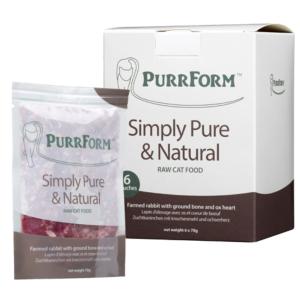 PURRFORM farmed rabbit meat and bone with Ox Heart is a complete natural pet food for adult cats that contains nothing more than the ingredients listed.Composition: Rabbit 80%, Ox Heart 20%